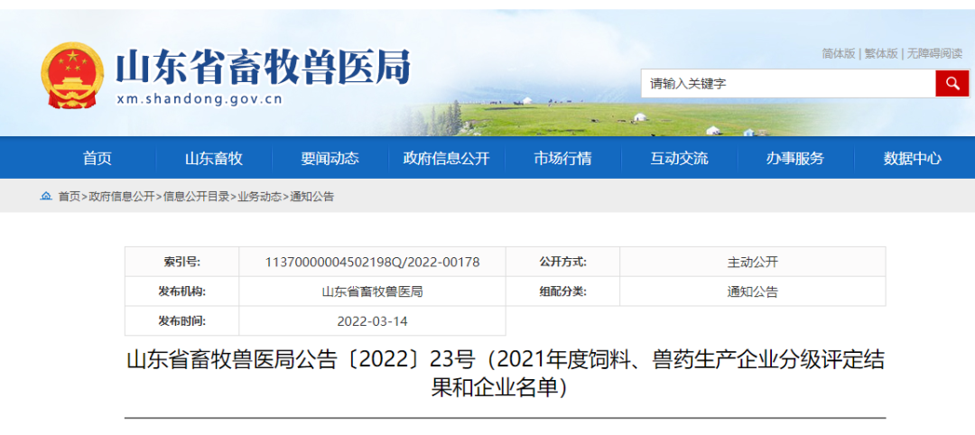 山東德信榮獲2021年度山東省獸藥生產企業A級評定