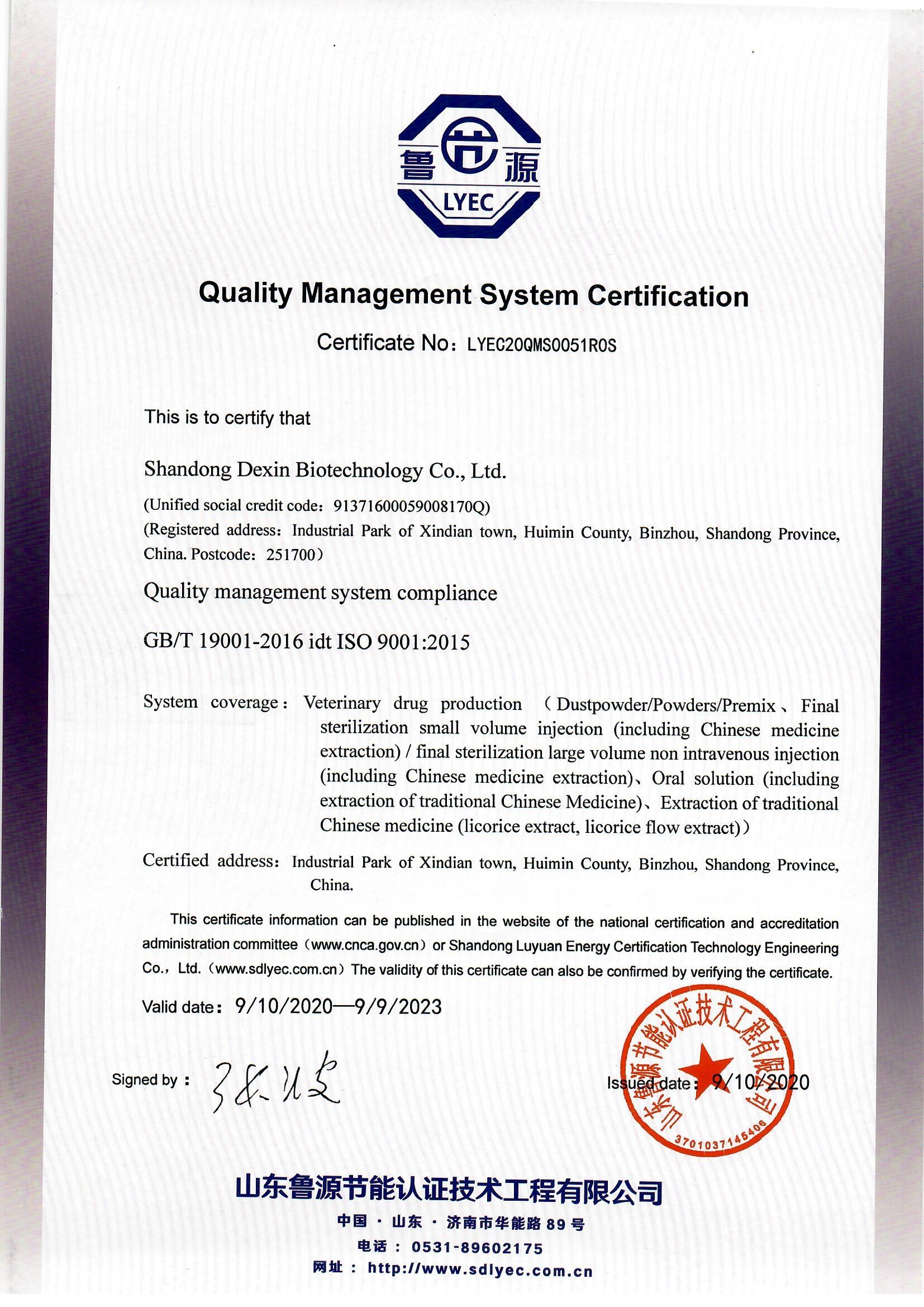 The company has multiple production lines for powder/granular/premix, final sterilized small-volume injection (including Chinese medicine extraction)/final sterilized large-volume non-intravenous injection (including Chinese medicine extraction), oral solution (including Chinese medicine extraction), Chinese medicine extraction (licorice extract, licorice fluid extract) and disinfectant (solid/liquid). In 2018, the company was rated as a provincial enterprise technology center, and in 2020, the company was rated as "Shandong Agricultural Industrialization Leading Enterprise" and "High-tech Enterprise". In recent years, it has won provincial and municipal honorary titles such as Provincial Service Industry Innovation Center, Science and Technology Small and Medium-sized Enterprise Certification, Shandong Academician Workstation, Binzhou Traditional Chinese Medicine Polysaccharide and Ecological Breeding Engineering Technology Research Center, Binzhou Livestock and Poultry Healthy Breeding Engineering Research Center and Binzhou Agricultural Industrialization Key Leading Enterprise. Always adhere to the enterprise concept of "do quality service for the public", rely on own elite scientific research team, strong financial strength ,cooperating with many famous University and other domestic scientific research institutes , comprehensively improve the ability of scientific and technological innovation.